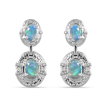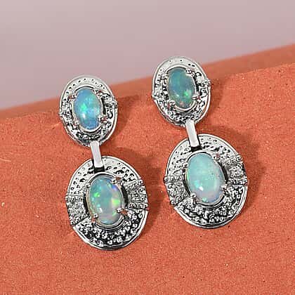 Ethiopian Welo Opal and Natural Cambodian Zircon Earrings (with Push Back) in Platinum Plated Sterling Silver 1.18 Ct.