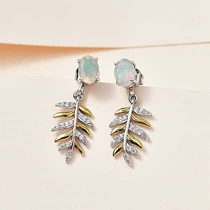These Ethiopian Opal, White Zircon Leaf Dangling Earrings feature Ethiopian Opal ovals in a 7x5mm faceted cut, set in sterling silver with a dual overlay of 18K yellow gold and platinum. The opals, known for their play-of-colour, are enhanced by the contrasting hues of the gold finish. The fine detailing of the leaf design in these earrings is brought to life by the dual finish, making them a stunning representation of nature's splendour.