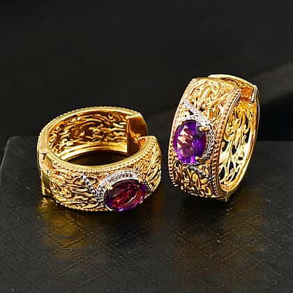 Bold and dramatic, these EverTrue African amethyst hoop earrings will surely grab the attention of passers-by. These earrings feel like miniature heirlooms reimagined for the modern wardrobe. Crafted in pure brass with a yellow gold tone and platinum overlay, the two-toned metal contrast adds architectural depth to the design. The richly ornamental earrings feature intricate filigree-style engravings that feel regal. These hoops feature deeply saturated, oval-cut African amethysts. They are bezel-set and its rich purple adds a touch of sophistication to the design. These hoops come with click-back closure that offers a seamless look.