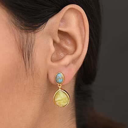 Displaying a dual-tone drop earring, featuring the earthy depth of Connemara marble with the refreshing hue of blue turquoise for a beautifully balanced look. Ex[pertly crafted in pure yellow brass, these earrings offer durability and lasting shine. Each earring features a turquoise stud that leads to a smooth marble drop, creating a perfect blend of colour and texture. Designed with a secure push post closure clasp, offering security and comfort wear. These are perfect for adding a natural touch to everyday or occasion wear.