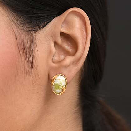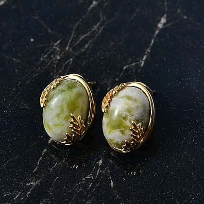 Crafted to reflect natural beauty, these earrings feature mesmerising Connemara marble, known for its calming green tones and organic marbling. The oval stones are set in a yellow gold tone, detailed with delicate leaf motifs for a touch of artistry. Designed with secure push-back posts, it offers comfort and a secure fit, making it suitable for everyday styling and looks. Each pair carries unique variations, making every piece truly individual.