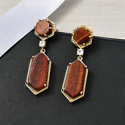 Bold and beautifully detailed, these earrings highlight striking red tiger eye gemstones paired with sparkling white topaz, adding extra shine. Crafted in pure yellow brass, the geometric octagon-and-elongated-hexagon design creates strong visual appeal with modern symmetry. The polished gold-toned frame enhances the stones' warm tones, offering a refined yet contemporary finish. With a secure push-back closure clasp and lightweight structure, these earrings are perfect for adding a sophisticated edge to any outfit.