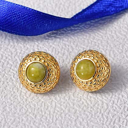 Crafted to reflect the beauty of nature, these earrings feature a smooth, round Connemara marble gemstone encased in a textured yellow-gold-tone frame. The intricate border enhances the stone’s rich green tone, creating a refined balance of texture and colour. With a polished finish and a secure push-post closure, these studs offer comfort and style for any occasion. A subtle yet striking piece that complements both modern and traditional looks.