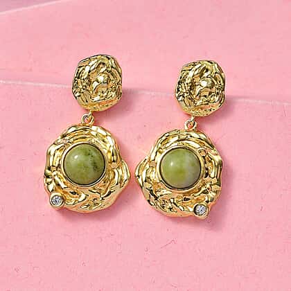 Artfully designed to make a statement piece, these earrings feature a round Connemara marble in a gentle green colour. The sparkling shine of white zircon enhances the beauty of Connemara. Crafted in yellow gold tone, the textured circular drops bring a sculptural touch that feels both organic and refined. Each element flows beautifully, creating a look that balances nature-inspired beauty with modern flair. The secure push-back closure ensures lasting comfort and stability for both daytime and evening wear.