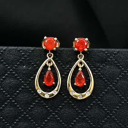 Designed for those who adore bold looks, these fire opal teardrop dangling earrings are a must-have. A glowing round fire opal sits at the lobe, dropping to a pear centre within a smooth teardrop frame, sprinkled with bright white zircon, offering robust, scratch-resistant sparkle. Fire opal is prized for its vivid red-orange hue; it flatters warm and cool skin tones. Set in gold plated 925 sterling silver that’s hypoallergenic, tarnish-resistant and won’t turn skin green, they’re comfortable for sensitive ears. Secure push backs make everyday wear easy. See images for design details.