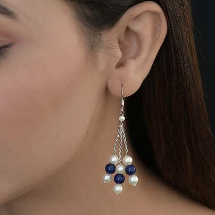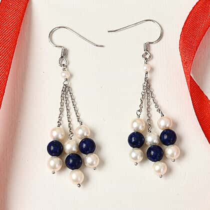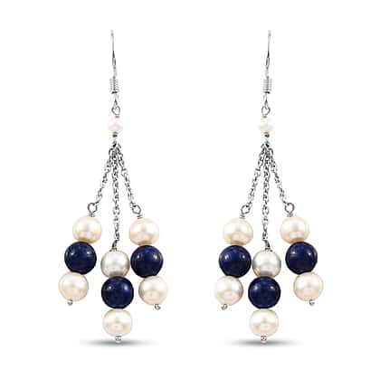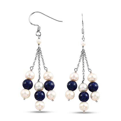 Freshwater Pearl and Lapis Lazuli Dangle Hook Earrings in Sterling Silver