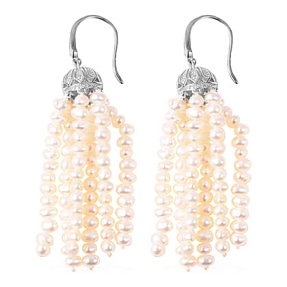 Freshwater Pearl Tassel Earrings with Hook in Rhodium Plated Silver