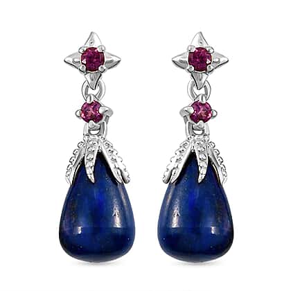 GP - Lapis Lazuli, Rhodolite Garnet and Kanchanaburi Blue Sapphire Dangling Earrings in Platinum Plated Sterling Silver, 10.94 Ct.