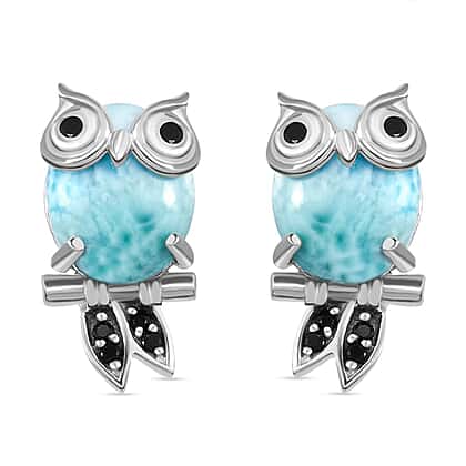 GP - Larimar, Black Spinel Owl Stud Earrings (With Push Back) in Platinum Overlay Sterling Silver 8.37 Ct.