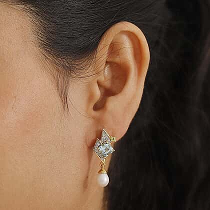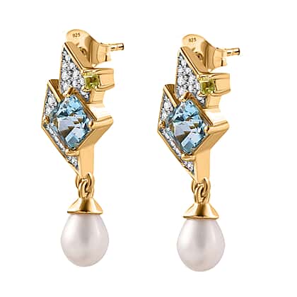 Enhance your jewellery collection with these stunning Art Deco-inspired Sky blue topaz dangling earrings. Embellished by peridot and white zircons, each gemstone is precisely set to reflect timeless elegance. The geometric design, enriched with a lustrous freshwater pearl drop, adds an opulent touch. Crafted in hypoallergenic, tarnish-resistant 18K vermeil yellow gold-plated sterling silver, these earrings are perfect for sensitive skin. The intricate detailing and exceptional craftsmanship make them an exquisite choice for both evening glamour and everyday luxury. Whether as a personal indulgence or a meaningful gift, these earrings beautifully capture sophistication and artistry in every facet.