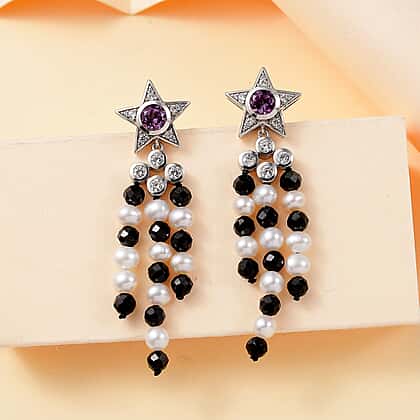 GP Celestial Collection - Starry Night Rose De France Amethyst, Pearl, Black Spinel & Zircon Earrings With Push Back in Rhodium Overlay Sterling Silver 21.81 Ct.