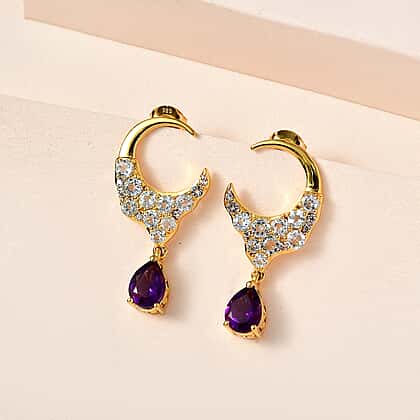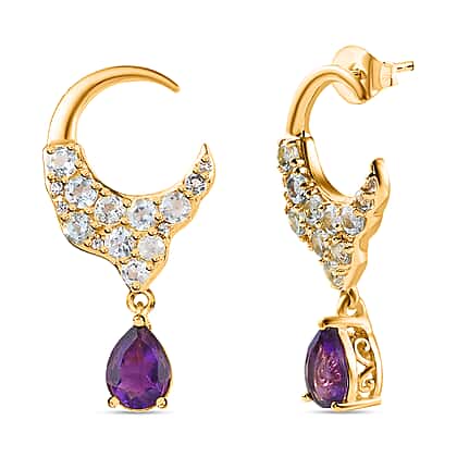 Make everyone go green with envy with our amethyst dangle earrings from the GP Celestial Collection, meticulously crafted in 18K vermeil yellow gold plated sterling silver. These stunning earrings feature a design showcasing a delicate Crescent Moon adorned with exquisite amethyst in drop shape, sky blue topaz, and natural zircon gemstones replicating the sparkling stars. The celestial-inspired elegance of these earrings is perfect for adding a touch of mystique and sophistication to any outfit.