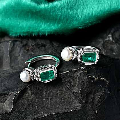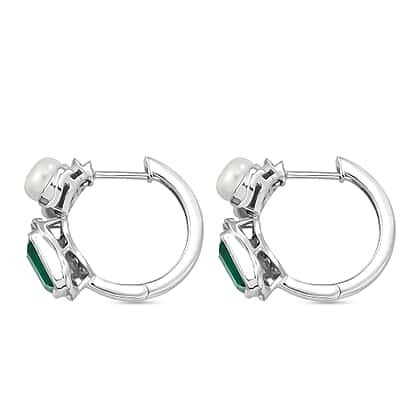 GP Emeraldine Triplet Quartz, Fresh Water Pearl & Kanchanaburi Blue Sapphire Full Hoop Earring in Rhodium Overlay Sterling Silver 3.90 Ct.
