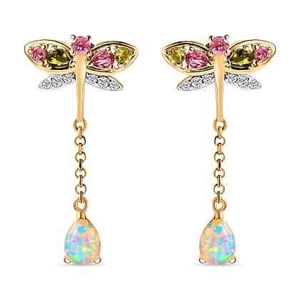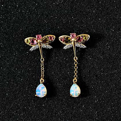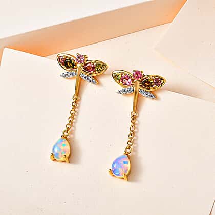 GP Italian Garden Collection Ethiopian Opal , Blue Sapphire , White Zircon , Multi-Tourmaline Dangling Earring in 18K Vermeil Yellow Gold Sterling Silver 2.97 ct, Silver Wt. 5.5 Gms 2.836 Ct.