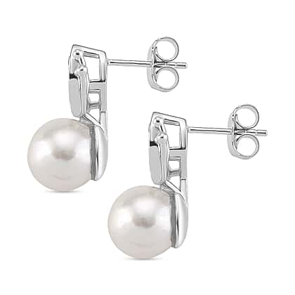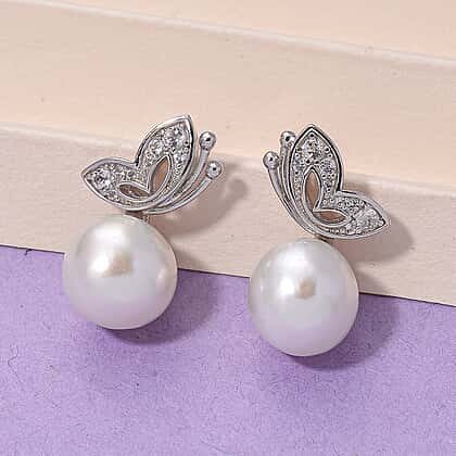 GP Italian Garden Collection - White Edison Pearl, White Topaz & Kanchanaburi Blue Sapphire Stud Earring in Rhodium Overlay Sterling Silver 1.73 Ct.