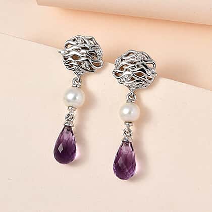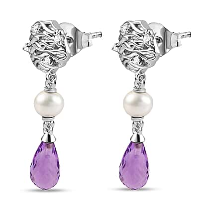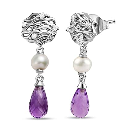 GP Pearl Collection - Amethyst, Fresh Water Pearl & Natural Zircon Dangle Earrings in Platinum Overlay Sterling Silver 7.78 Ct