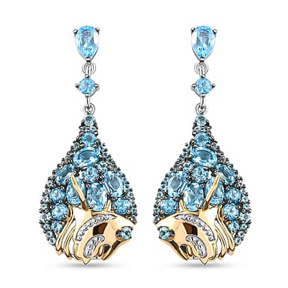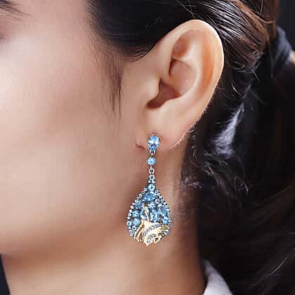Make heads turn around with these enticing swiss blue topaz dangle earrings. These tear-drop earrings are encrusted with vivid shapes, sizes and cuts of gemstones secured in a prong setting giving out a lush sky-blue colour. It is made from 925 sterling silver with platinum and vermeil yellow gold overlay featuring a fish design at the bottom with tiny milgrain detailing on the frame. You can stack these earrings for a festival or special occasion to elevate the look of your outfit.