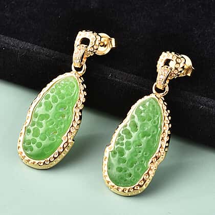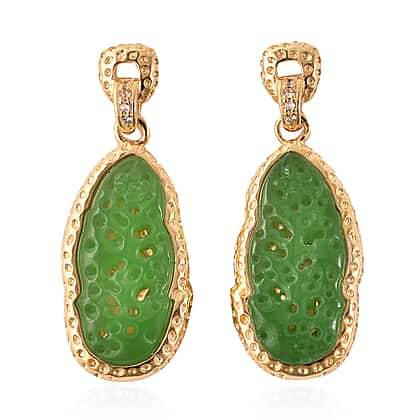 9.55 Ct Green Jade and Cambodian Zircon Drop Earrings in Yellow Gold Plated Sterling Silver
