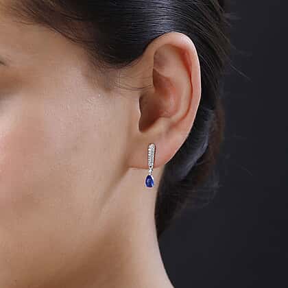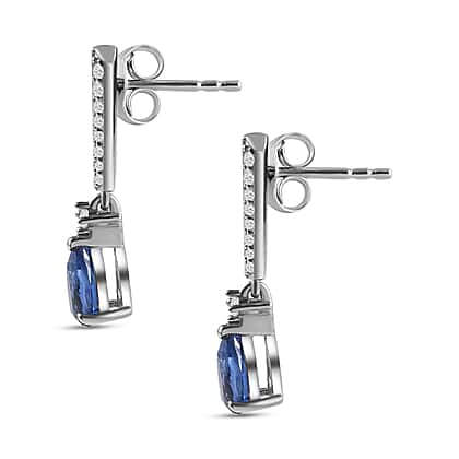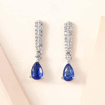 Add a pop of blue to your look with these beautiful Kashmir Blue Kyanite and Natural Cambodian Zircon solitaire stud earrings. The pear-shaped Kashmir Blue Kyanite stone (0.948 carats) is faceted for a stunning sparkle and impresses you with a drop look. Set in a platinum overlay sterling silver frame, the earrings are durable yet lightweight. The pushback design ensures a comfortable and secure fit that makes them easy to wear.