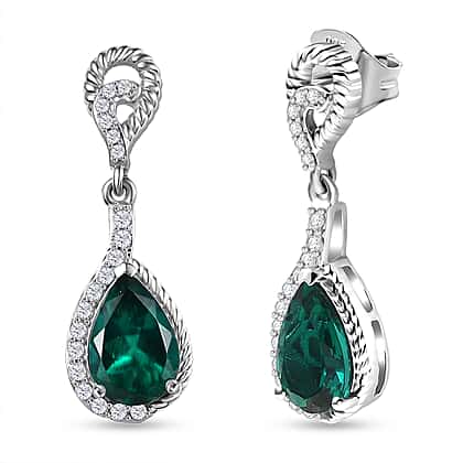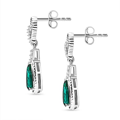 D'joy Lab Grown Emerald, White Zircon Dangling Teardrop Earring in Rhodium Overlay Sterling Silver 2.62 Ct.