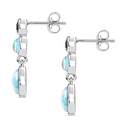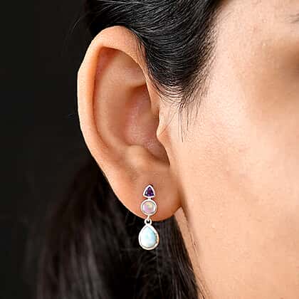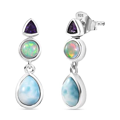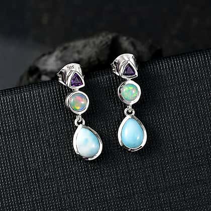 Larimar, Ethiopian Opal & African Amethyst Stud Push Post Ethereal Drops Earring in Rhodium Overlay Sterling Silver 2.31 Ct.