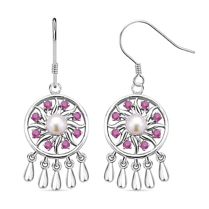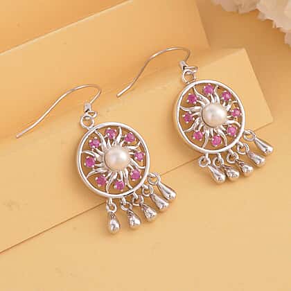 Lucy Q - Fissure Filled Ruby ,Fresh Water Pearl Fancy Earring (With Hook) in Rhodium Overlay Sterling Silver 1.60 Ct.