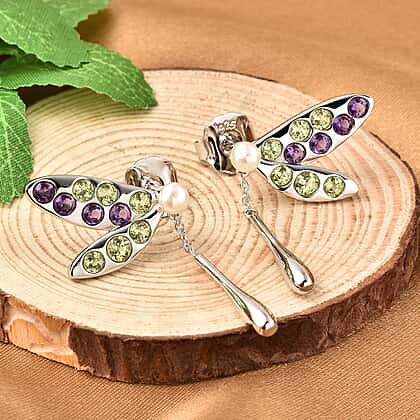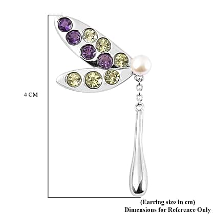 LucyQ Dragonfly Collection - Freshwater White Pearl, Hebei Peridot and Amethyst Earrings in Rhodium Overlay Sterling Silver 3.430 Ct.
