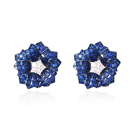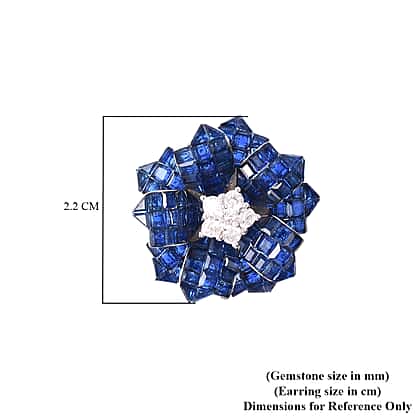 Lustro Stella - Simulated Blue Sapphire and Simulated Diamond Floral Stud Earrings (with Push Back) in Rhodium Overlay Sterling Silver, Silver wt. 6.00 gms