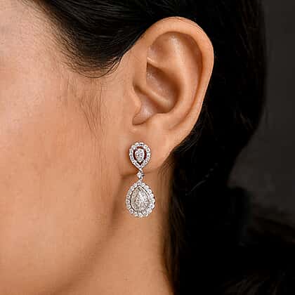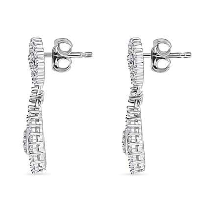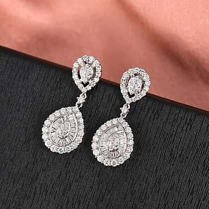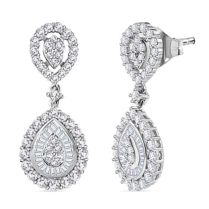 Add radiance to your special occasions with these lab grown diamond dangling earrings set in rhodium overlay sterling silver. Designed in a dual teardrop motif with intricate detailing, they feature a stunning fusion of round and baguette-cut lab grown diamonds for brilliant sparkle and fire. The diamonds are SI-GH graded, offering clarity and visual brilliance close to natural diamonds. Crafted from 925 sterling silver, the setting is hypoallergenic, tarnish-resistant, and ideal for sensitive skin. The push back design ensures a secure and comfortable fit. These elegant drops make a beautiful statement, bringing together timeless charm and responsible luxury for today’s modern woman.