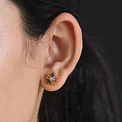 Luxuriant - Multi-Tourmaline & Lab Grown Diamond (SI-G-H) Earring with Push Post in Yellow Gold Plated Sterling Silver 1.62 Ct.