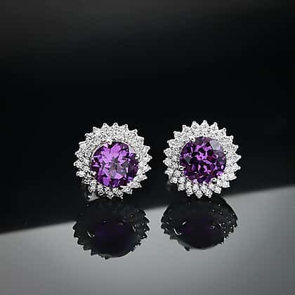 Certified and Appraised LUXURIANT 4.18 Ct. AAA Lab Grown Purple Sapphire, Lab Grown Diamond Halo Push Post Earring in 9K White Gold AGI Certified (VS/EF)