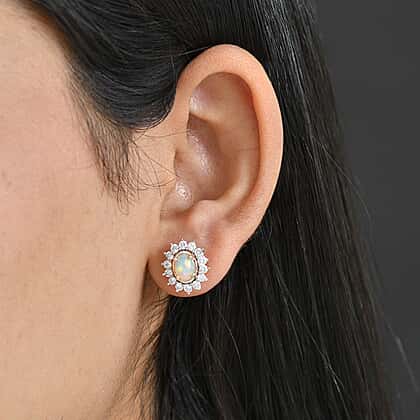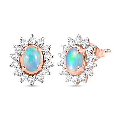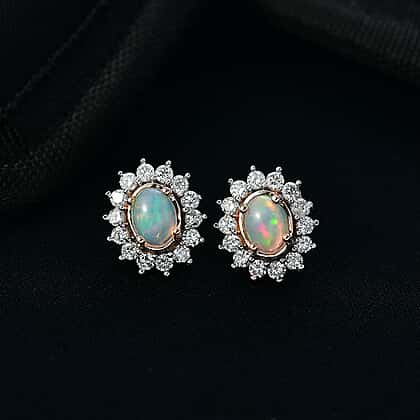 LUXURIANT Ethiopian Opal, Lab Grown Diamond Halo Earring with Push Back in 18K Vermeil Rose Gold Plated Sterling Silver 2.18 Ct.