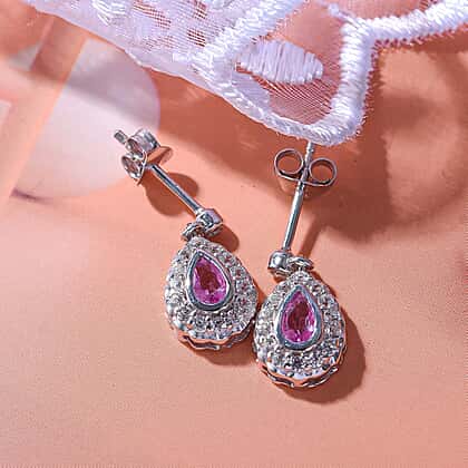 Madagascar Pink Sapphire & Natural Zircon Dangle Earrings in Rhodium Overlay Sterling Silver 1.08 Ct
