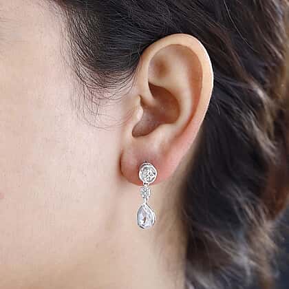 Each of these Dangle Earrings in Rhodium Overlay Sterling Silver feature a set of two Mercury Mystic Topaz gemstones. A round topaz overlooks a pear-shaped sibling from a decorated bail in the earpieces. The stones are bezel set for extra safety. Silver makes an understated backdrop for the shifting hues of the topaz gemstones to take centre stage.