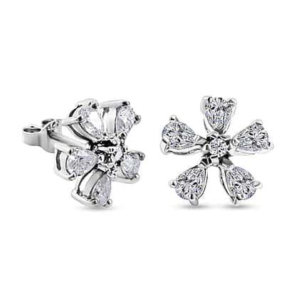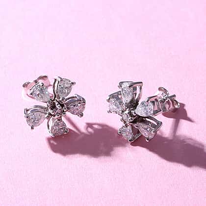 1.76 Ct Moissanite Floral Stud Earrings (With Push Back) in Rhodium Overlay Sterling Silver