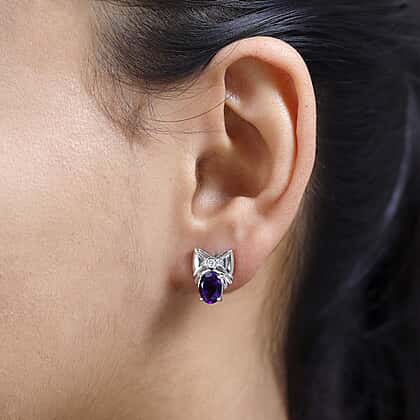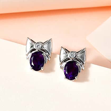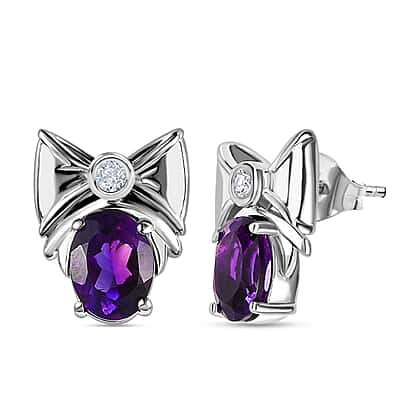 Regal and enchanting, Moroccan amethysts grace these fascinating earrings in a bow-shaped design. Their calming purple hues promote clarity and sobriety. Natural zircons frame the amethysts, creating a celestial halo. The sterling silver base, with its platinum overlay, ensures lasting beauty. Versatile and captivating, these earrings transition seamlessly from casual outings to formal affairs.