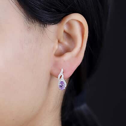 Moroccan Amethyst & White Zircon SolitaireStud Push Post Earring With Push Back in Rhodium Overlay Sterling Silver 1.97 Ct.