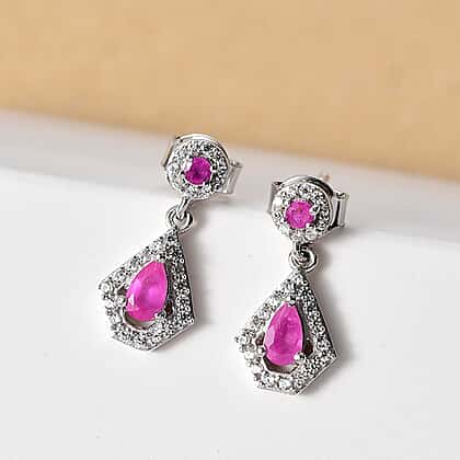 Mozambique Ruby & White Zircon Dangling Earring in Rhodium Overlay Sterling Silver 1.09 Ct.