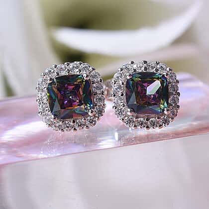 Mystic Cubic Zirconia & White Cubic Zirconia Stud Halo Earrings with Push Back in Rhodium Overlay Sterling Silver 2.94 Ct.