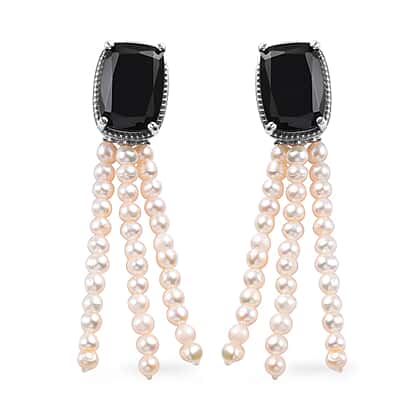 32.50 Ct Boi Ploi Black Spinel and Freshwater Pearl Chandelier Earrings in Platinum Plated Silver