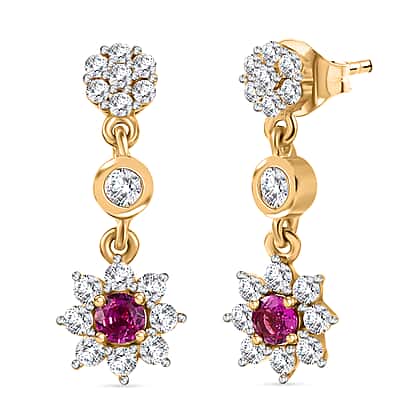 Natural Unheated Ruby, White Zircon Floral Dangling Earring in 18K Vermeil Yellow Gold Over Sterling Silver 1.24 Ct.