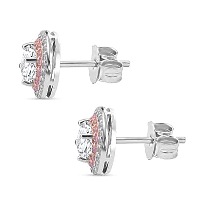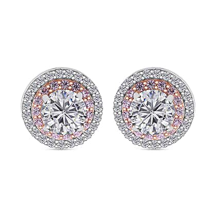 White Cubic Zirconia, Pink Cubic Zirconia Double Halo Earrings in Rhodium Overlay Sterling Silver 1.70 ct.