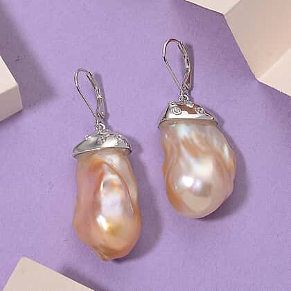 Peach Baroque Pearl & White Zircon Earring with Lever Back in Rhodium Overlay Sterling Silver 70.41 Ct.
