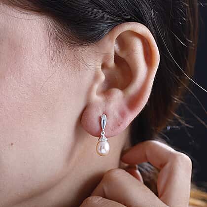 Radiating a gentle, moon-like glow, these Pink Fresh Water Pearl Drop Earrings are designed to add elegance to your look. The earrings are set in Sterling Silver and studded with 9x7mm pink freshwater pearl drops suspended from a delicate frame. The earrings, which gracefully hang from the neck, are studded with push posts to give them secure closure.
