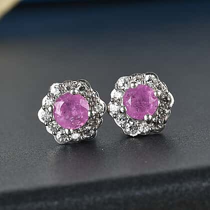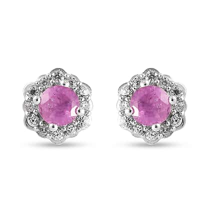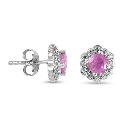 Pink Sapphire and Natural Cambodian Zircon Floral Stud Earrings (with Push Back) in Platinum Overlay Sterling Silver 2.00 Ct.
