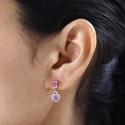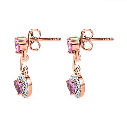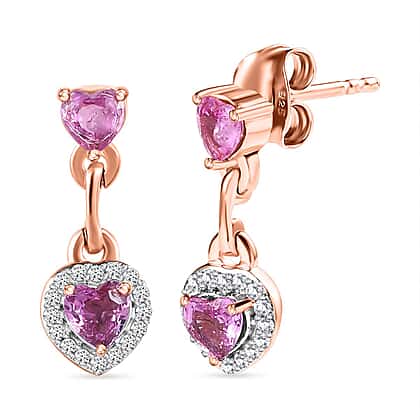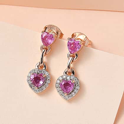 Pink Sapphire & Moissanite Heart Earrings in Vermeil Rose Gold Plated Sterling Silver 1.35 Ct.