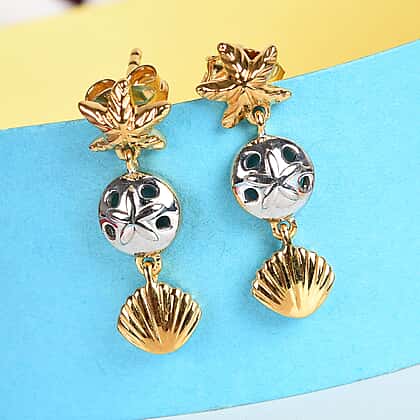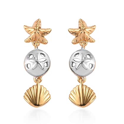 Platinum and Yellow Gold Overlay Sterling Silver Star Fish and Sea Shell Dangle Earrings (with Push Back)