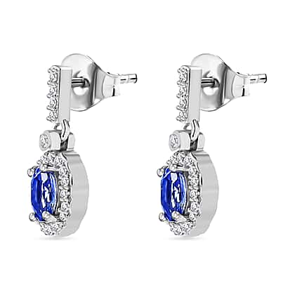 Tanzanite , White Zircon Dangling Halo Earrings in Rhodium Overlay Sterling Silver