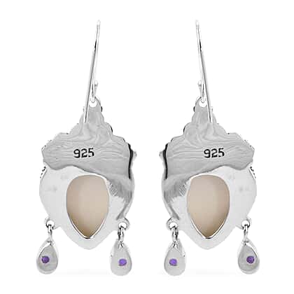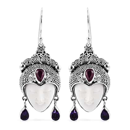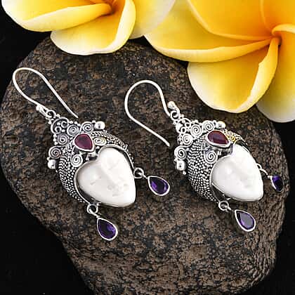 Princess Bali Collection OX Bone Carved Face, Amethyst and African Ruby Dewi Lakshmi Hook Earrings ( in Sterling Silver 2.591 Ct.