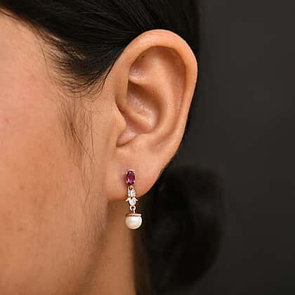 Radiant Ember Garnet, Fresh Water Pearl & White Zircon Earring with Push Back in 18K Vermeil Rose Gold Plated Sterling Silver 3.51 Ct.